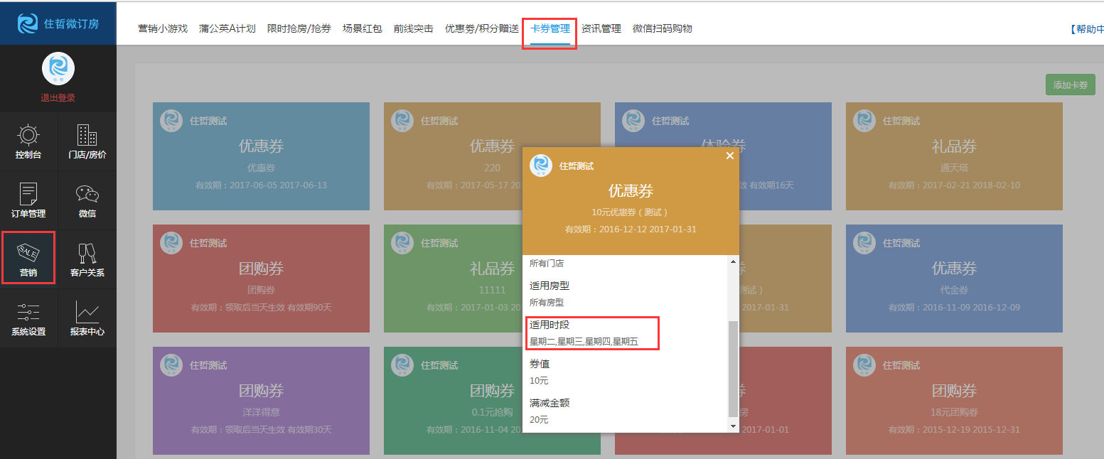 如下图所示,适用时段(此处的适用时段是预订的日期而不是入住的日期)是星期二、星期三、星期四、星期五,那么如果今天的日期是周六,在预订的时候这张优惠券就不会显示。