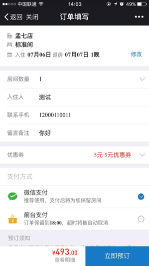 全新优化的预订流程由原来的5步变2步,提高预订转化率,预订的保留时间同步PMS设置,新增价格明细查看功能,页面信息一目了然。