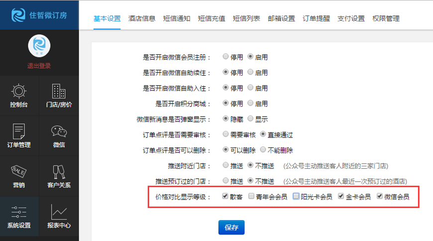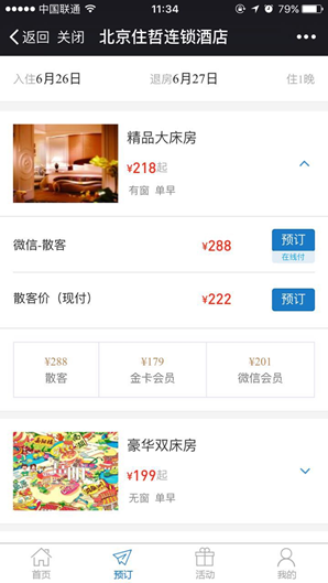 微信端房型页面的显示的不同会员等级的价格支持选择显示,可能差价对比,引导客人升级会员卡。
