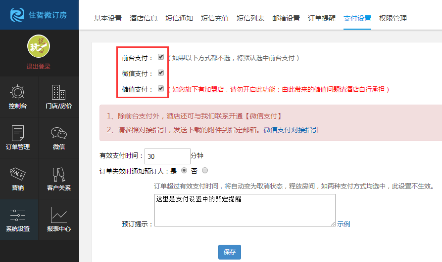 1、查看微订房系统设置中的对应的支付是否开启