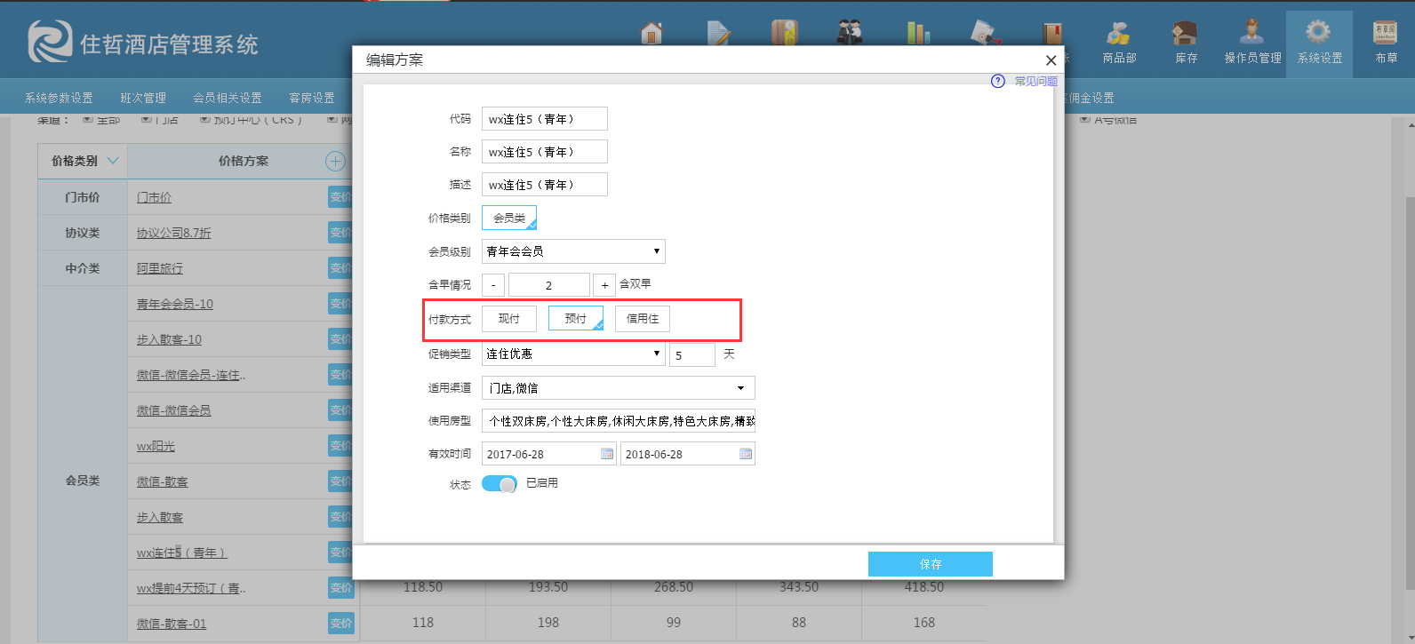 3、检查PMS中的价格方案是否设置了预付