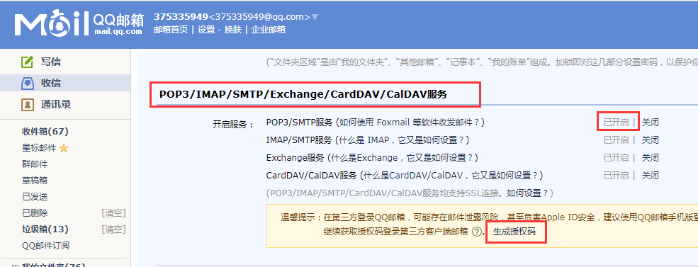 2、在账户界面下方找到 POP3/IMAP/STMP/Exchange/CardDAV/CalDAV服务,如POP3/SMTP服务未开启,请开启此服务,然后点击下方的“生成授权码”