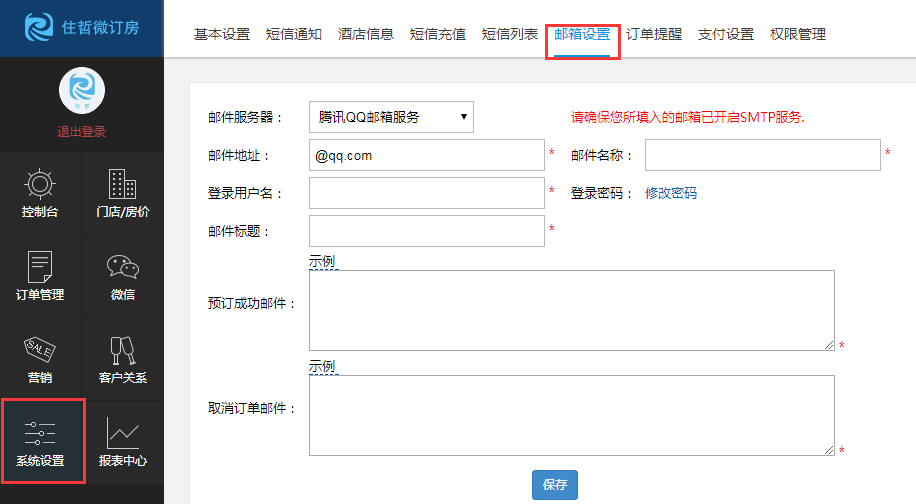 4、登录微订房,进入到系统设置 -> 邮箱设置 界面,如下图所示