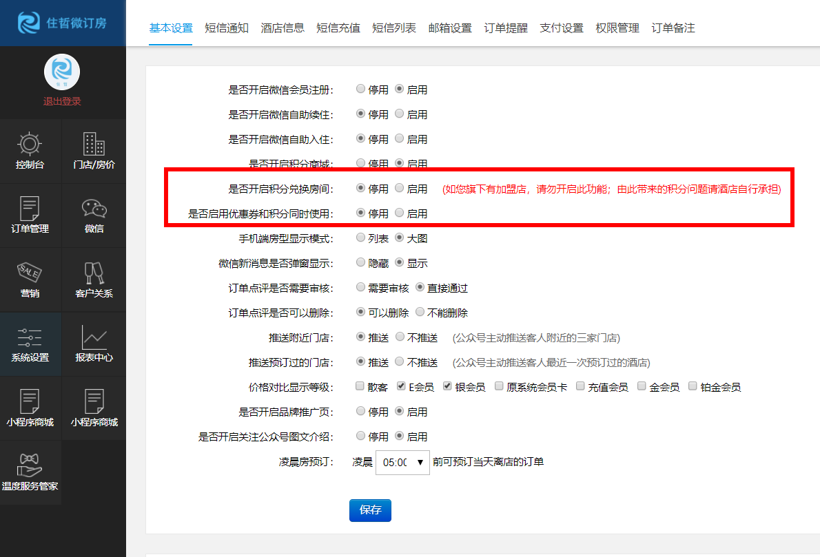 2)酒店可选择是否启用积分兑换房间功能。