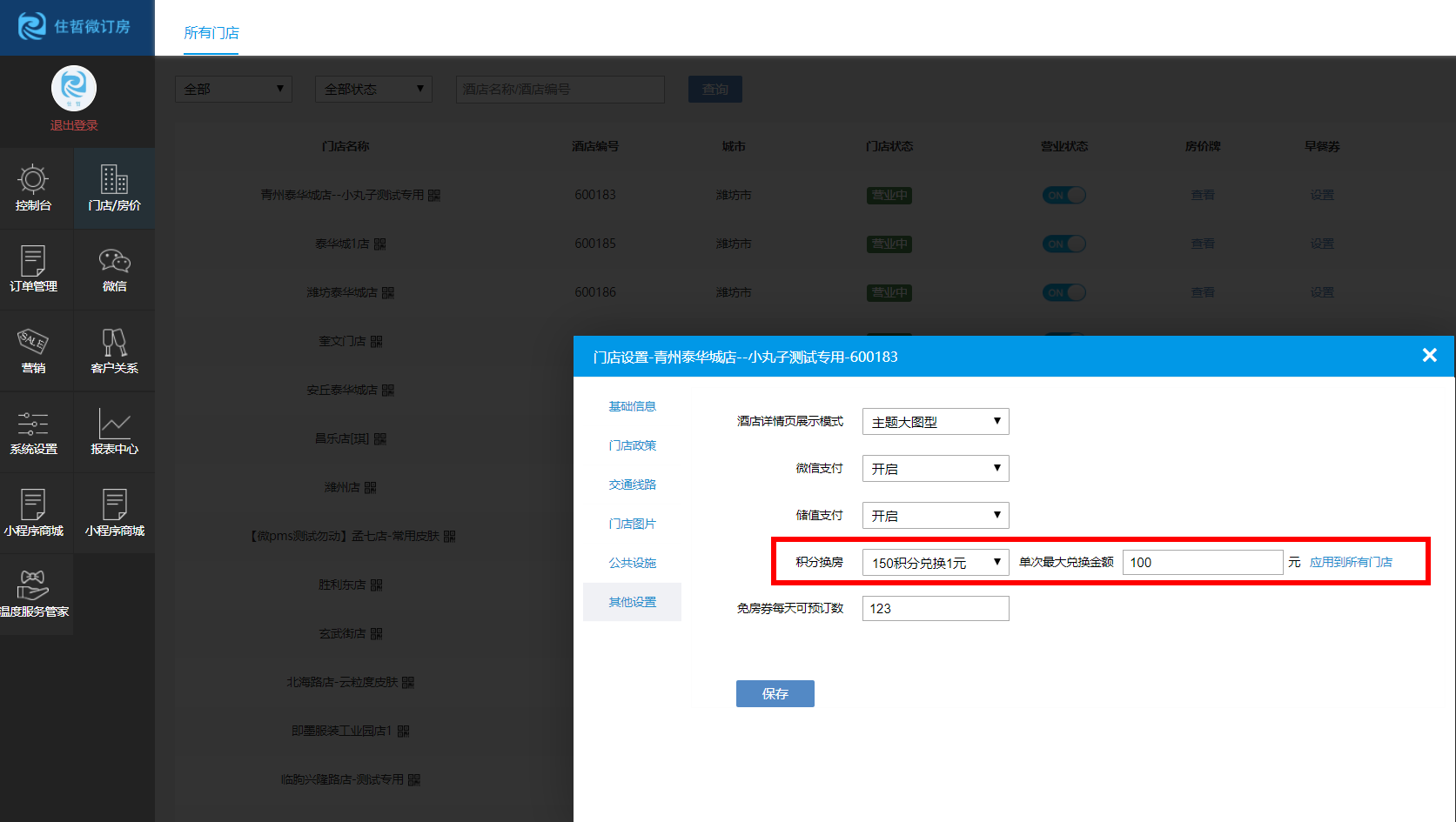 3)在微订房门店/分店资料下方,可选择PMS设置的积分兑换方案和允许兑换最大的金额