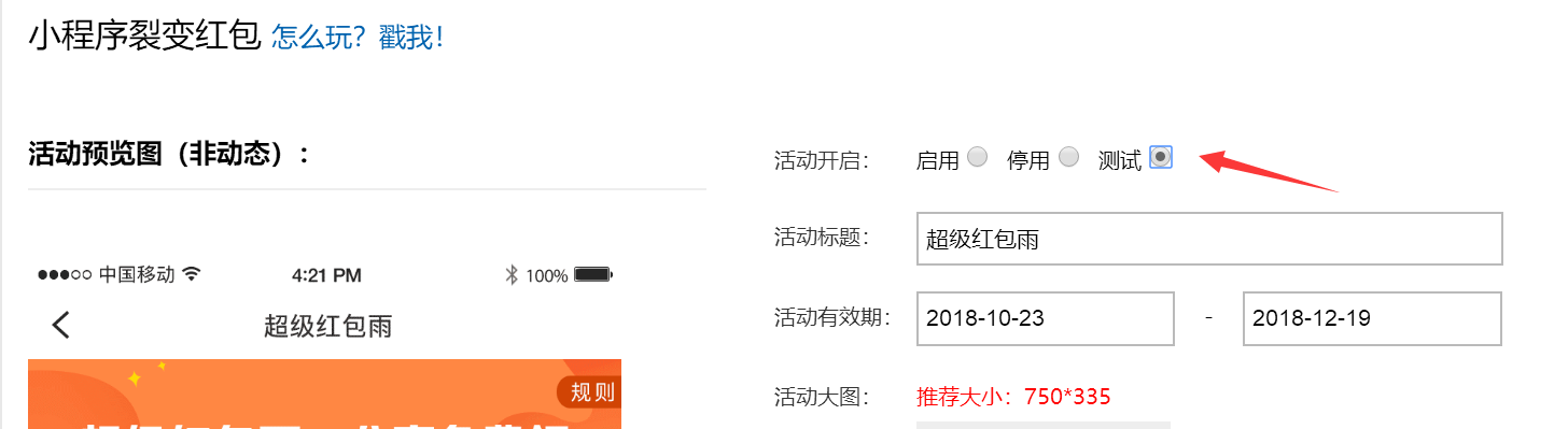 请设置完后 回到小程序裂变红包或者砍价营销,添加一个奖励为现金0.3元测试。