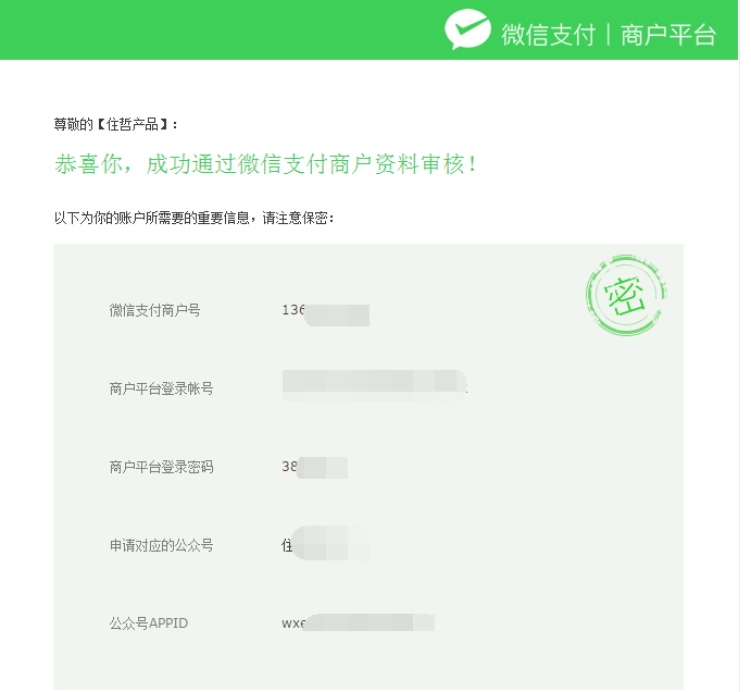 注意:登录商户平台的账号和密码为申请商户平台时下发到申请邮箱的账号密码,如下图所示。