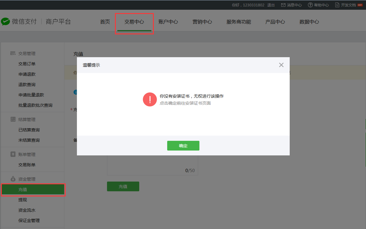 2、点击顶部导航栏中的交易中心,然后在左侧导航中资金管理中选择充值,如下图所示,如提示“您没有安装证书,无权进行该操作”请点击确认,按提示指引进行安装,安装成功后,填写充值金额,使用网银进行充值。