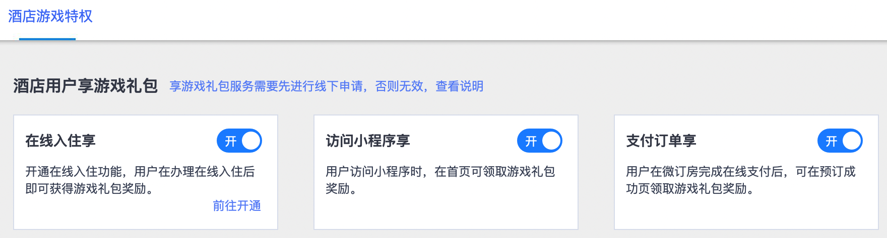 开启后,用户使用在线入住,完成办理后,在办理成功页可领取游戏礼包福利。