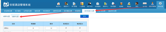 3、设置结算项目。系统设置 - >入账项目显示设置 - > 结算项设置 - > 勾选微信付款(如果使用码枪支付请选择此项目)和微信支付(如果使用打印二维码到RC单或在电脑屏幕上生成二维码的方式,请选择此项目) -> 保存