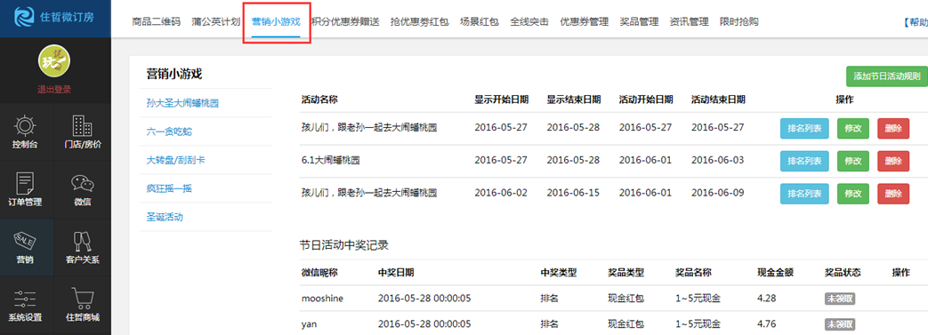 2、营销功能中,将所有小游戏全并到“营销小游戏”菜单下;
