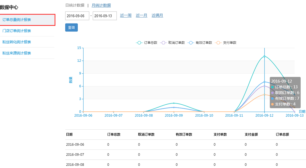 7、全新上线报表中心:订单总量统计报表、门店订单统计报表、粉丝转化统计报表、粉丝来源统计报表;