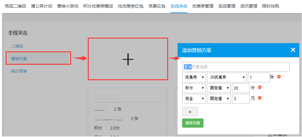 营销方案主要应用于前线突击的二维码,当客人关注此二维码后,会赠送营销方案中的优惠券/积分/现金