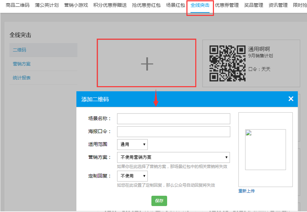 9、场景二维码功能移至”营销“菜单中,并新增场景二维码相关报表;