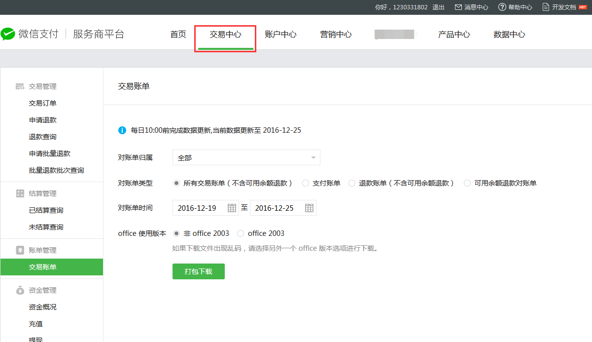 3、调整需要对账的时间段,点击打包下载