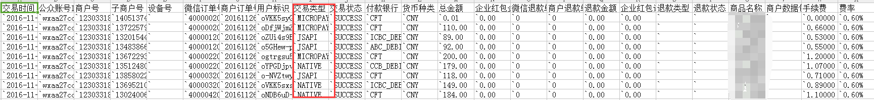 4、下载成功后打开EXCEL,如下图所示,主要关注交易类型,JSAPI是指微订房微信支付、MICROPAY是指码枪支付、NATIV是指PMS中扫描二维码支付
