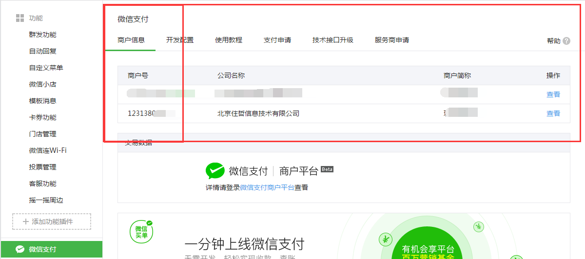 2、在左侧菜单中找到“微信支付”并点击,然后在打开的页面中点击“商户信息”