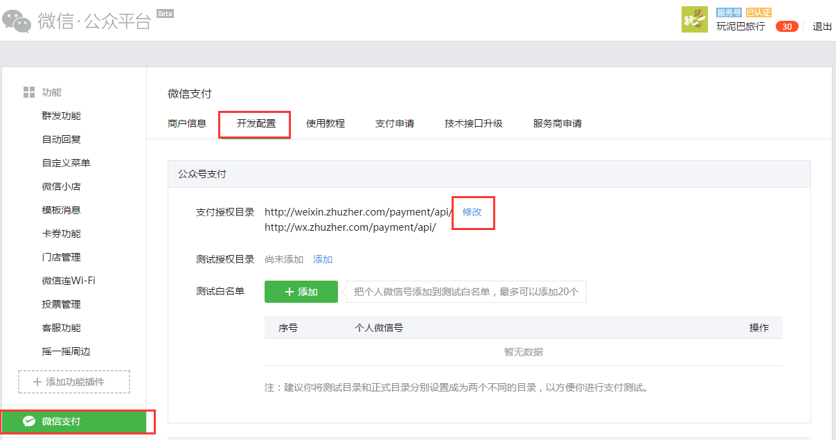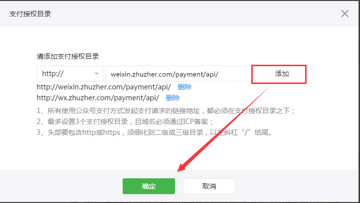 4、如您未设置过支付授权目录,请添加支付授权目录,如已添加过,请点击修改,在打开的的窗口中写授权目录