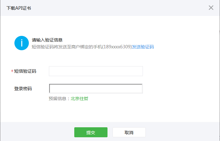 4、输入获取的验证码和商户平台的登录密码(非公众平台的登录密码),点击提交可开始下载 (如遇下载失败,请更换浏览器后再试)